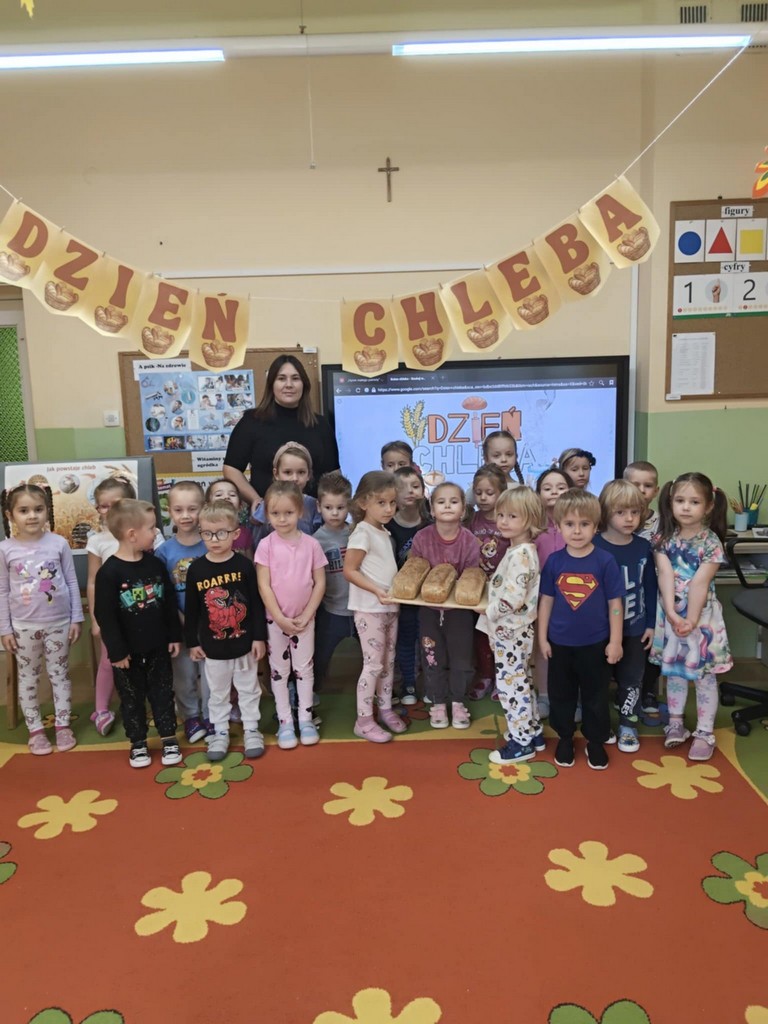 Dzieci poznały etapy powstawania chleba – od ziarenka zboża aż po gotowy bochenek na naszym stole. Dowiedziały się, skąd bierze się mąka, jak wygląda ziarno pszenicy oraz jakie są rodzaje chleba: pszenny, żytni, graham, razowy czy z ziarnami.