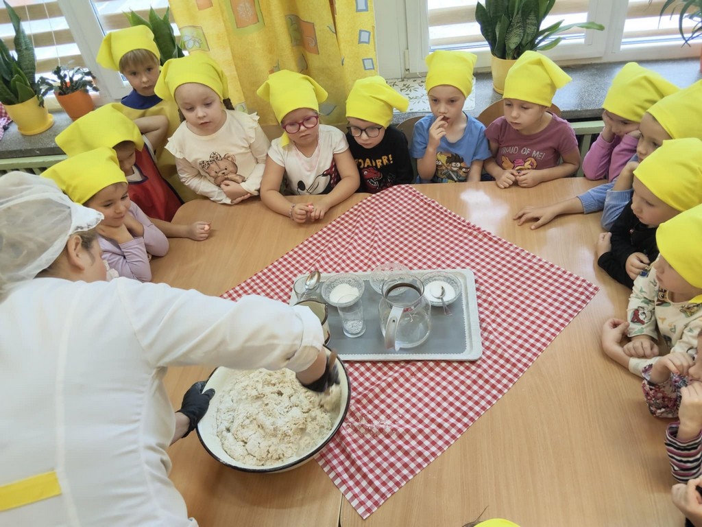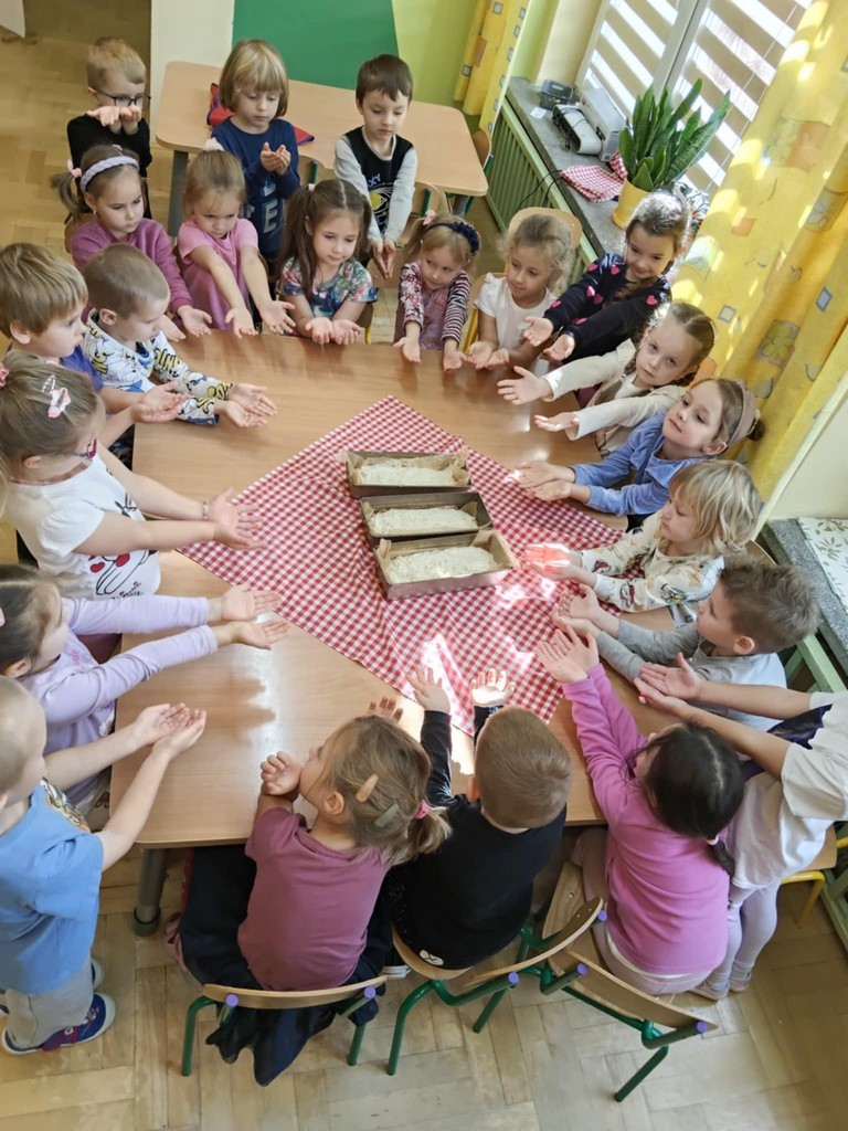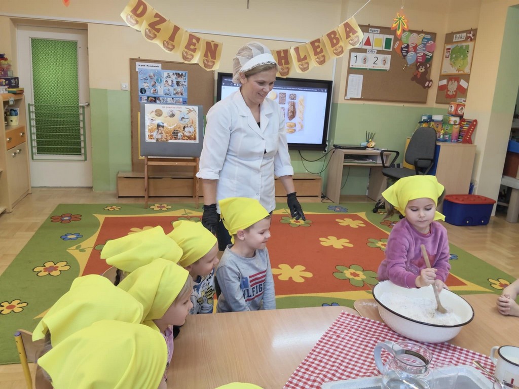 Największą atrakcją dnia było samodzielne pieczenie chleba. Przedszkolaki z zaangażowaniem mieszały składniki, obserwowały, jak ciasto rośnie, a potem z zachwytem wąchały zapach świeżo upieczonego bochenka. W piątek podczas śniadania ze smakiem zajadały się swoim wypiekiem.