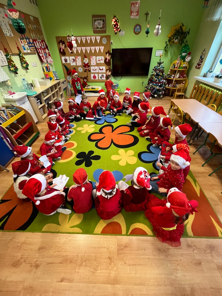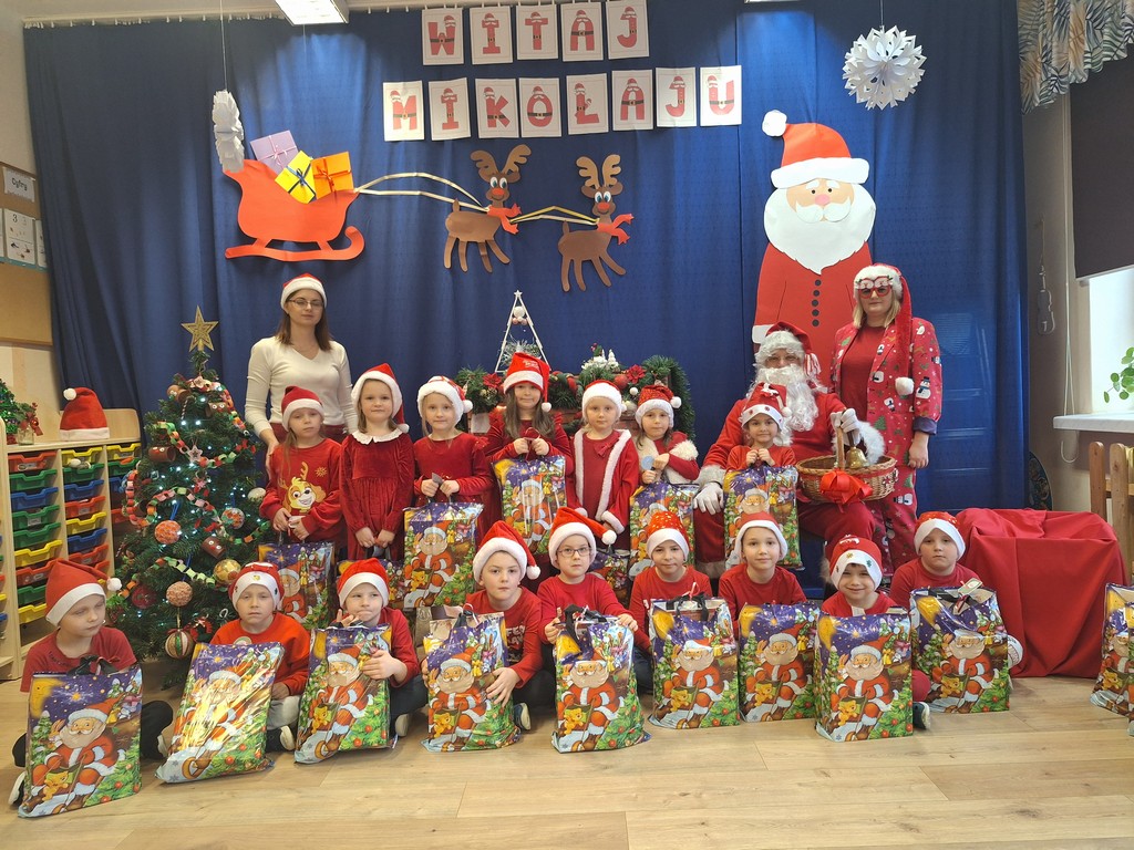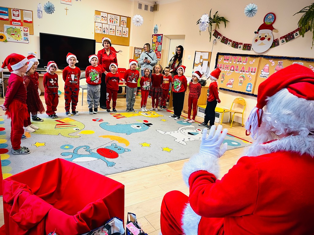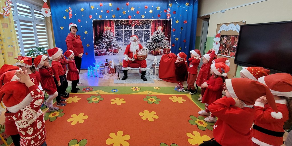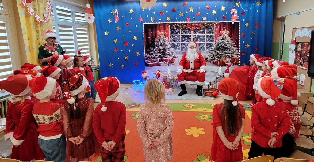 W piątek 5 grudnia nasze przedszkole odwiedził Mikołaj! Była to wyjątkowa i długo wyczekiwana wizyta. Już od rana dzieci z podekscytowaniem nasłuchiwały dzwoneczków, a gdy Mikołaj pojawił się w drzwiach, w sali rozbłysły uśmiechy i prawdziwa świąteczna magia. Dzieci, wpatrzone w Mikołaja, z uwagą wysłuchały jego opowieści o podróży, a następnie pięknie wystąpiły prezentując wiersze i specjalnie przygotowane piosenki.