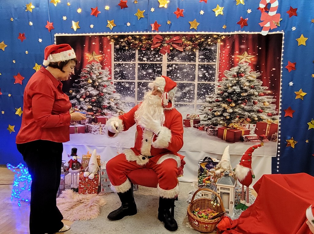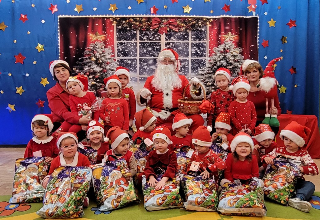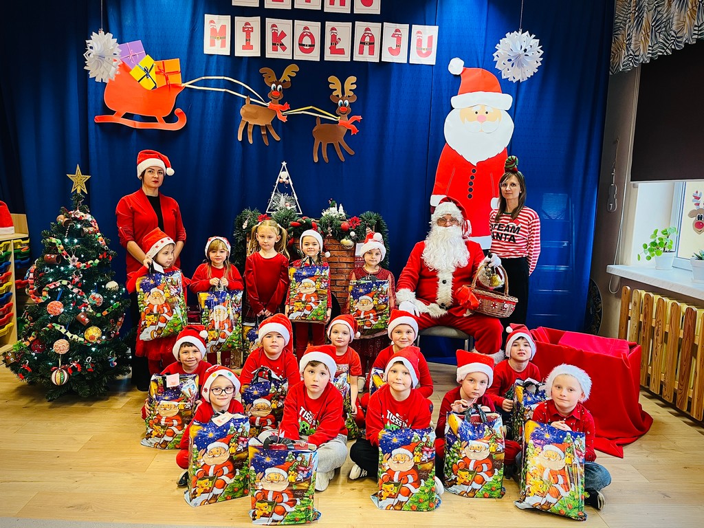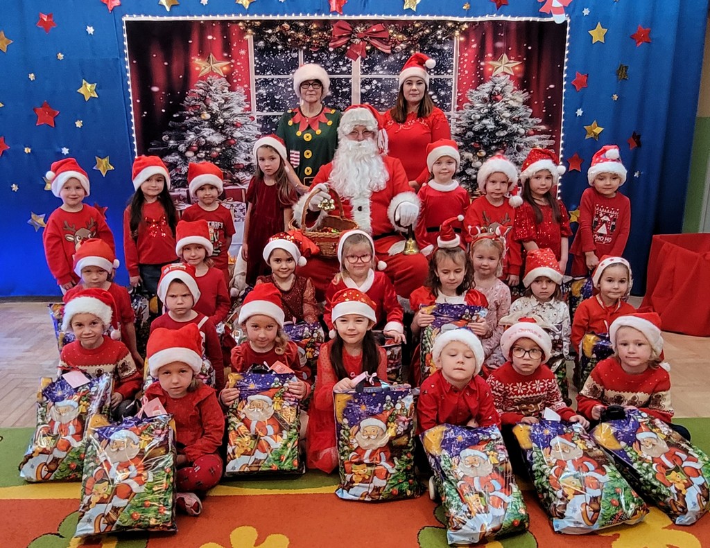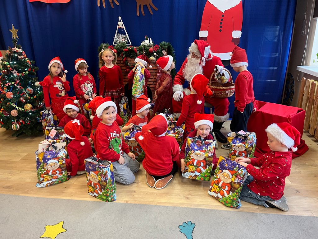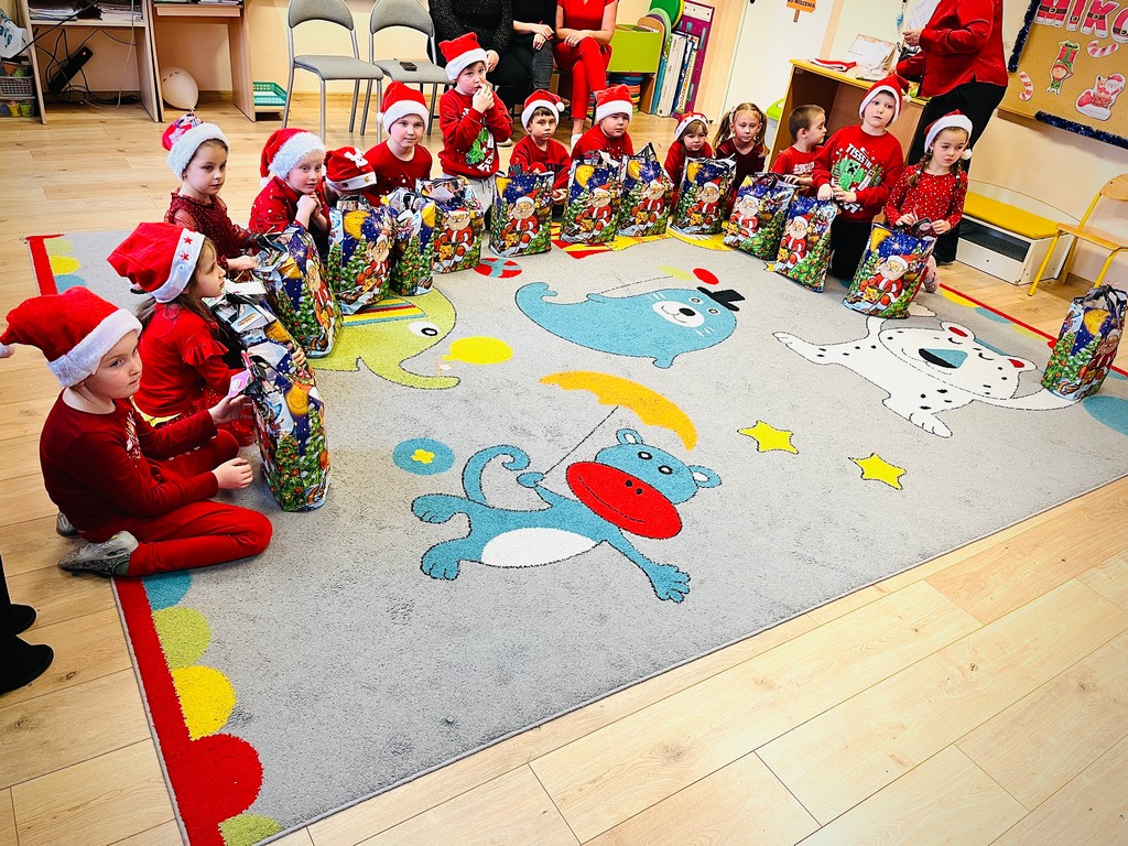Każde dziecko otrzymało wymarzony prezent i miało okazję na chwilę rozmowy z Mikołajem. Przedszkolaki pamiętały o magicznym słowie, z radością dziękując Mikołajowi za podarunek.
