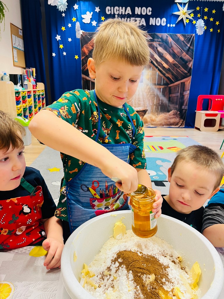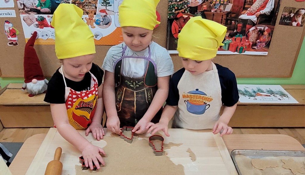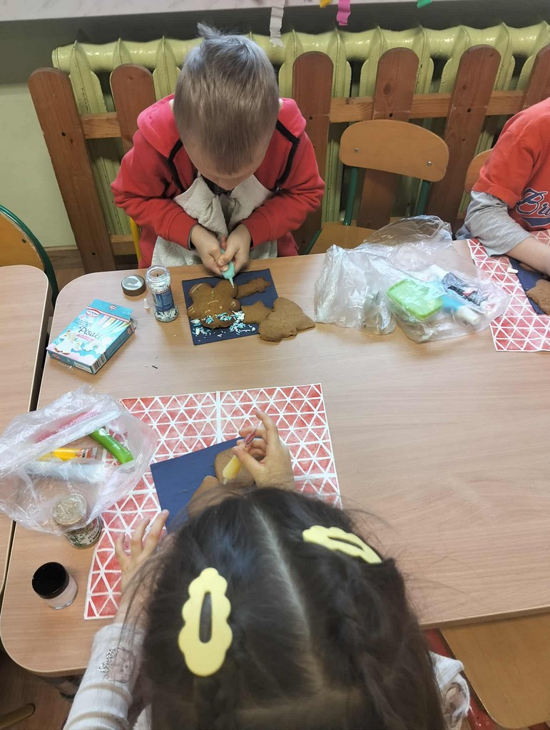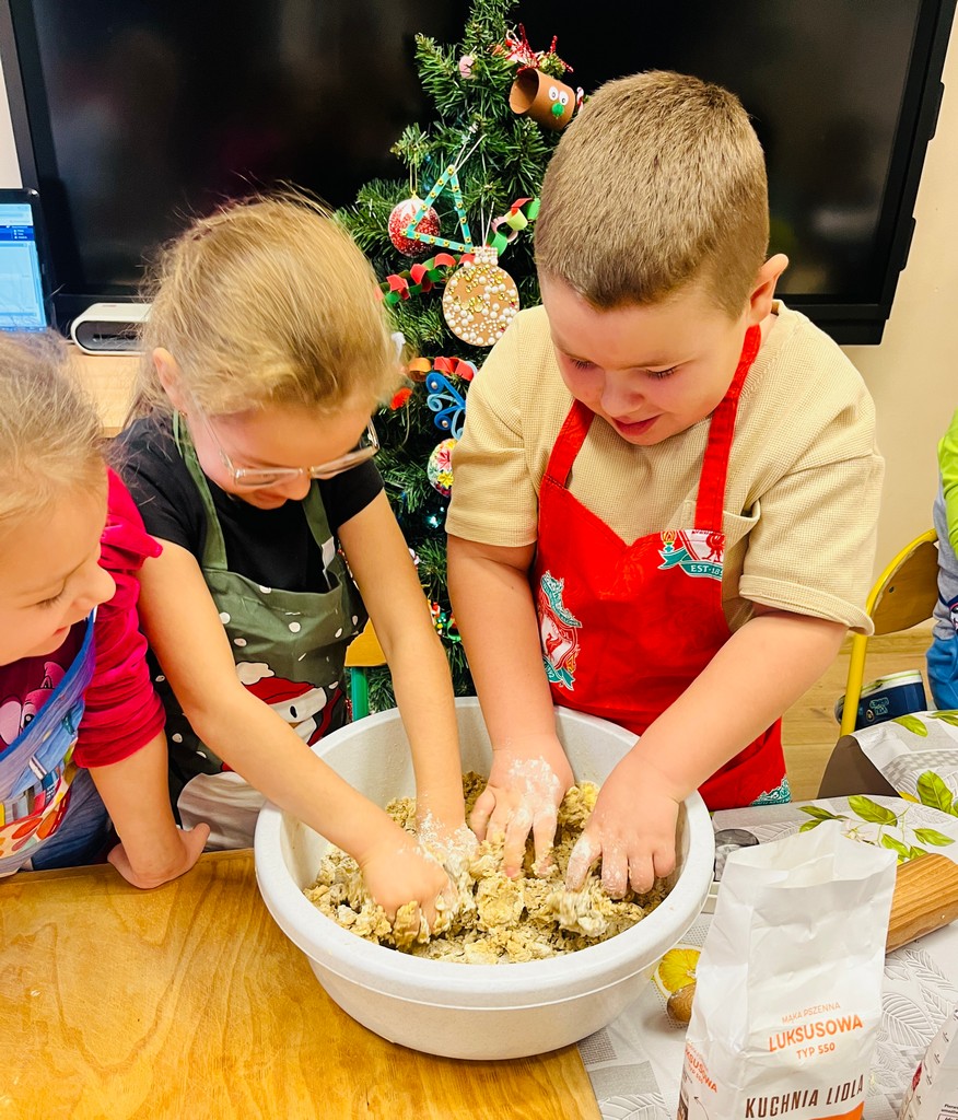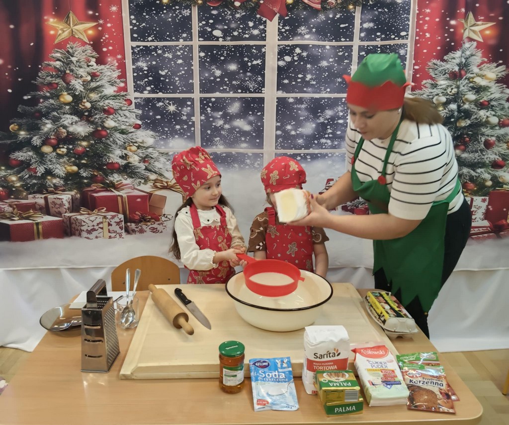 Przedszkolaki wałkowały ciasto, wykrawały pierniki w różnych kształtach oraz poznawały tajniki przygotowywania świątecznych wypieków. Nie zabrakło także dekorowania ciasteczek kolorowymi lukrami i posypkami.