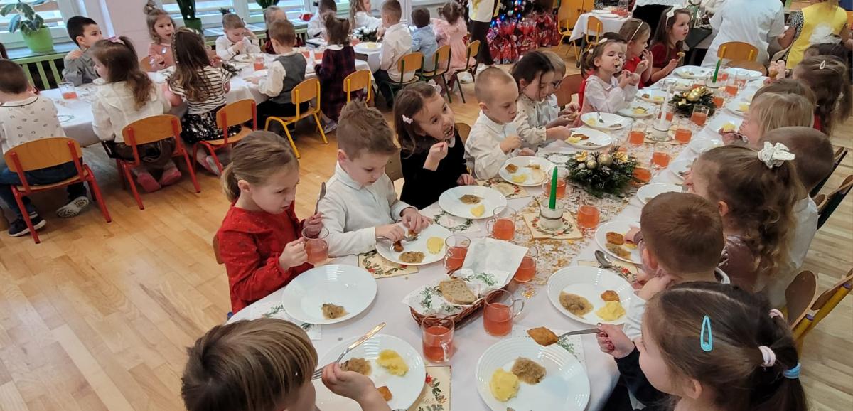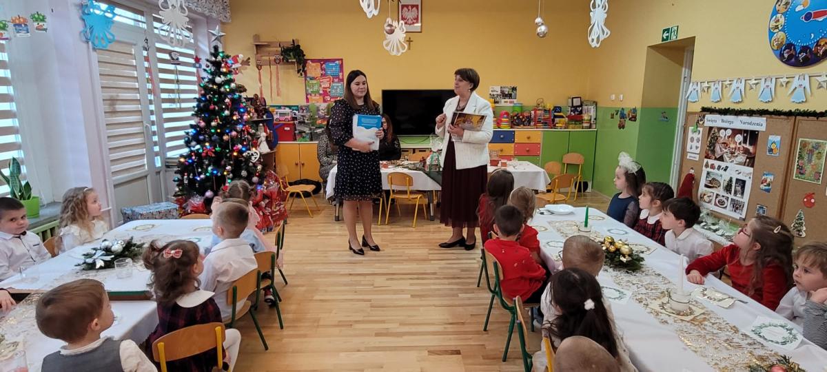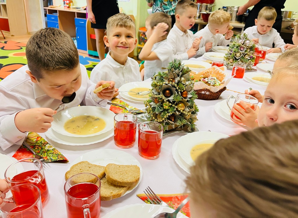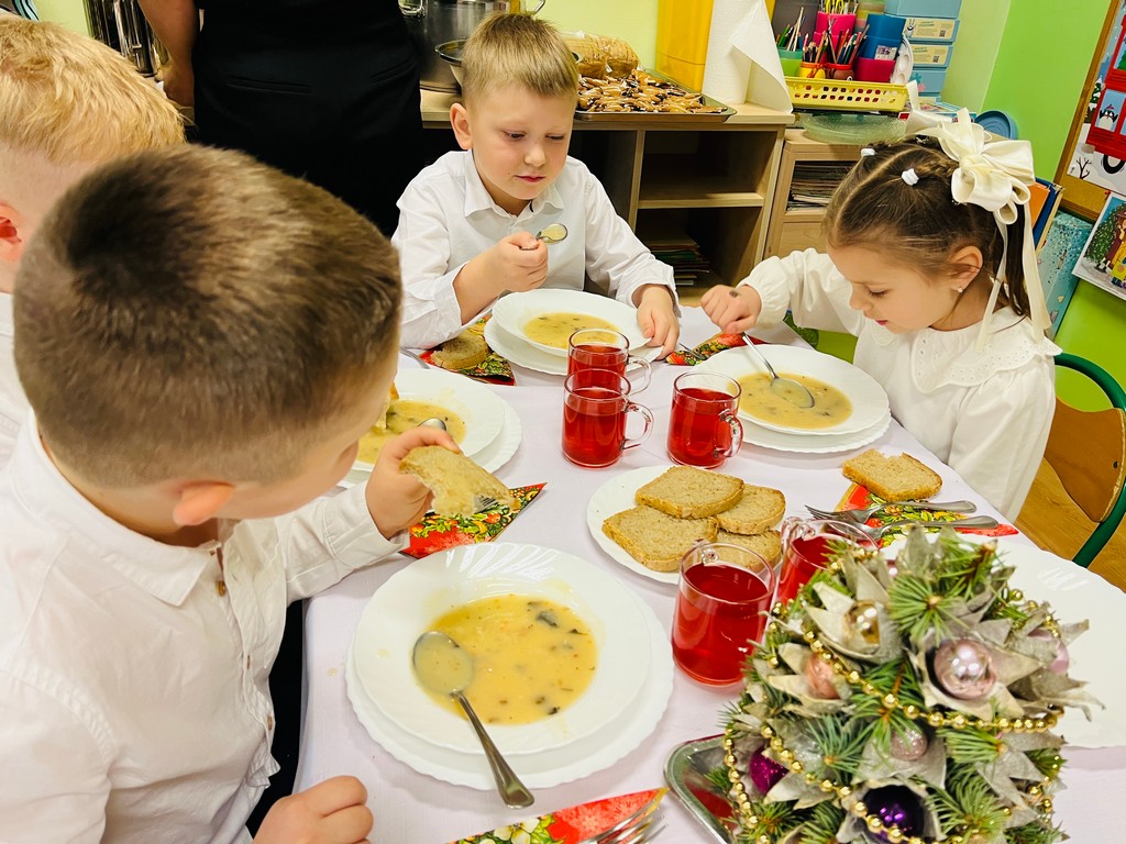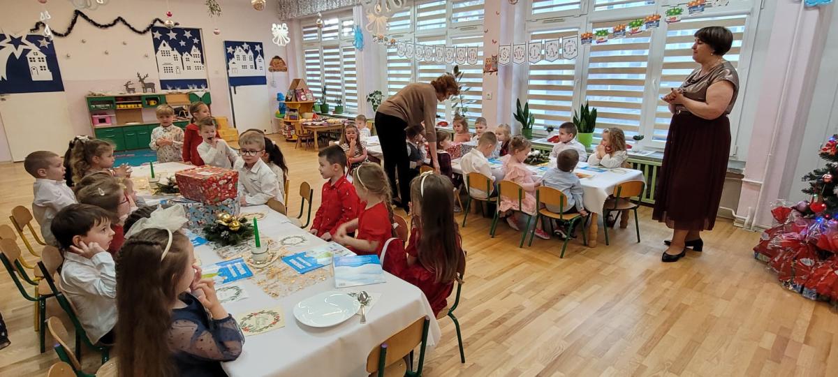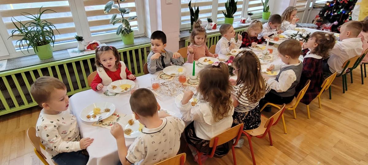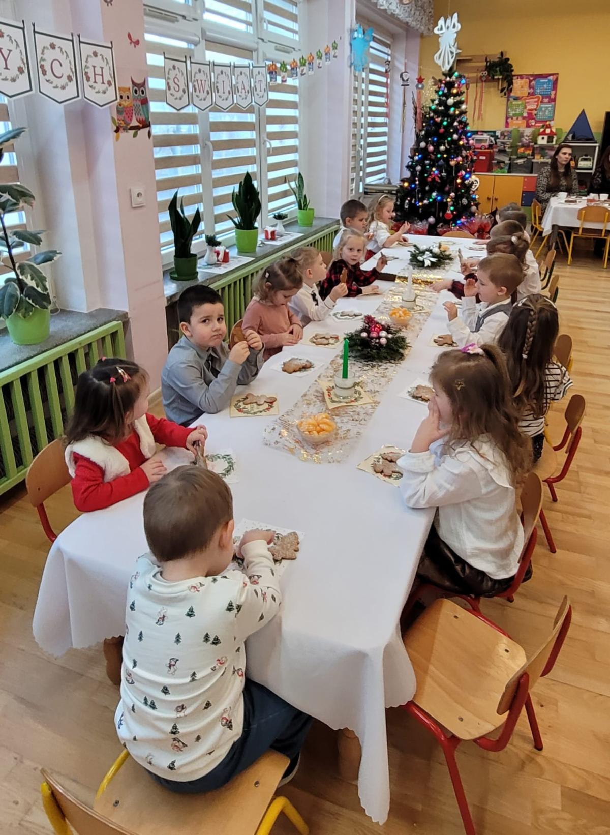 Najważniejszym momentem tygodnia była przedszkolna wigilia. Przy wspólnym, świątecznie udekorowanym stole dzieci dzieliły się opłatkiem, składały sobie życzenia oraz śpiewały kolędy. Towarzyszyła temu atmosfera życzliwości, bliskości i wzajemnego szacunku.