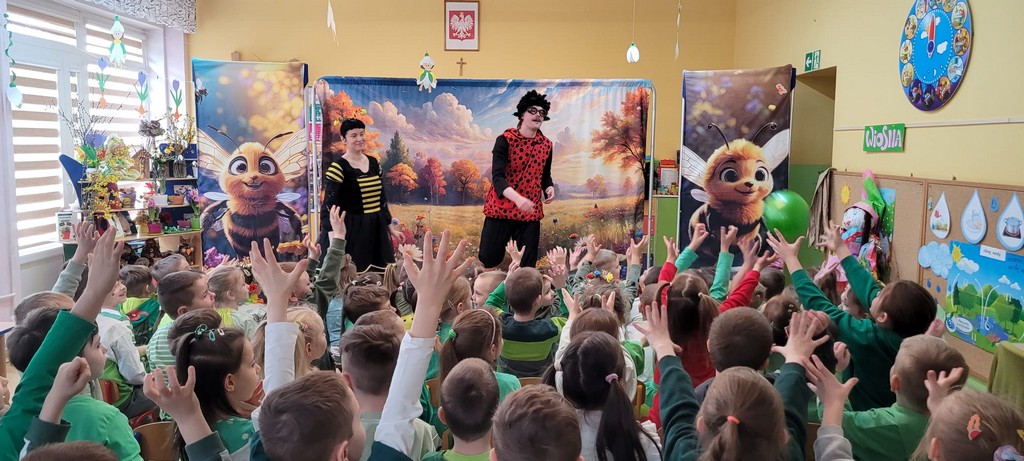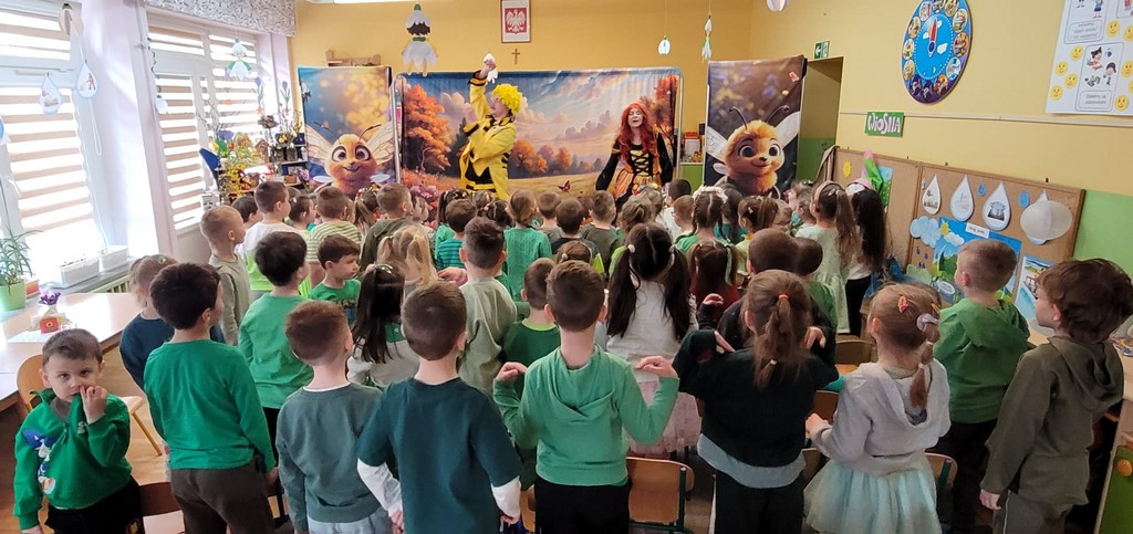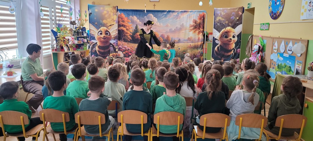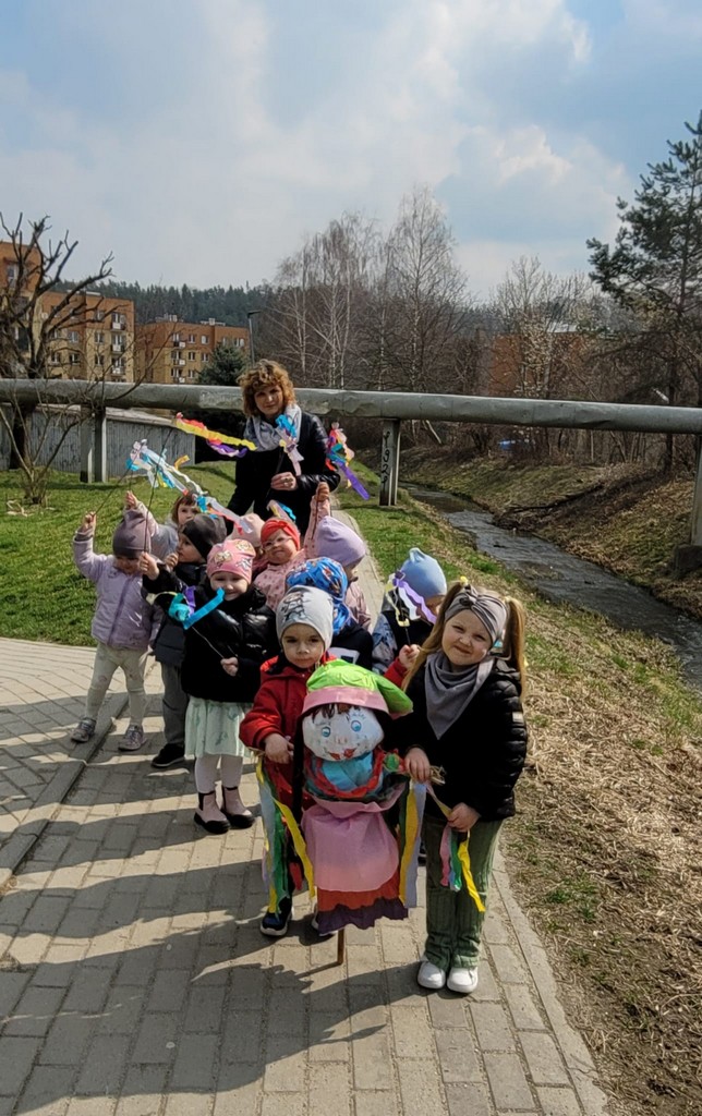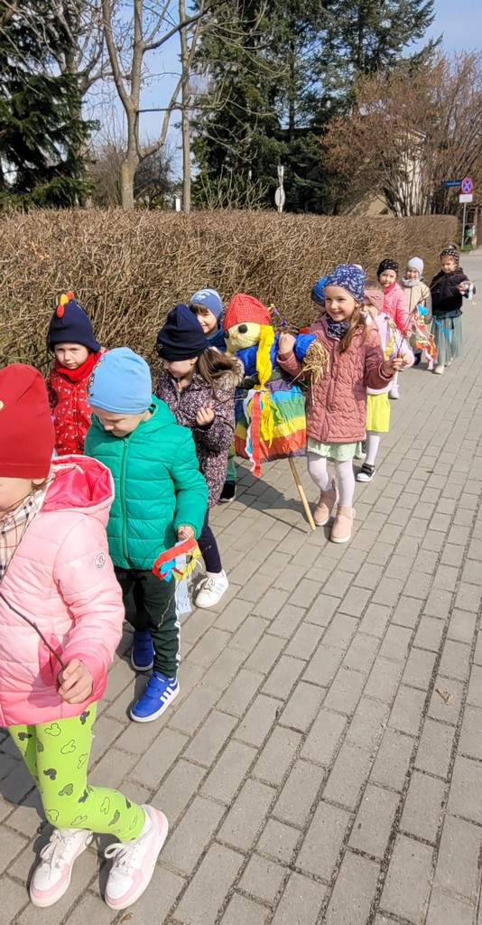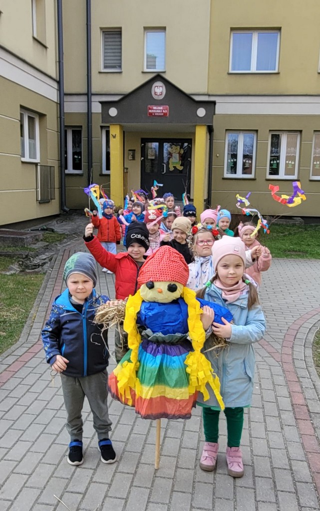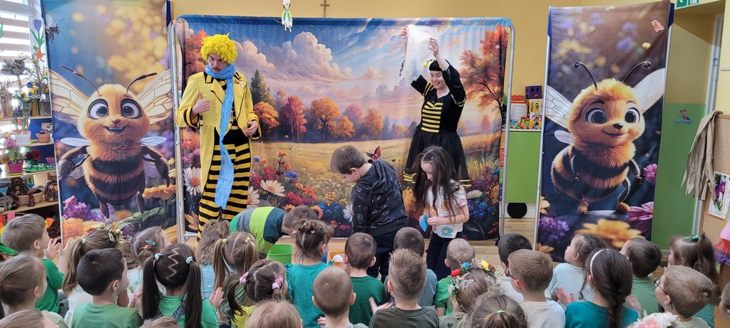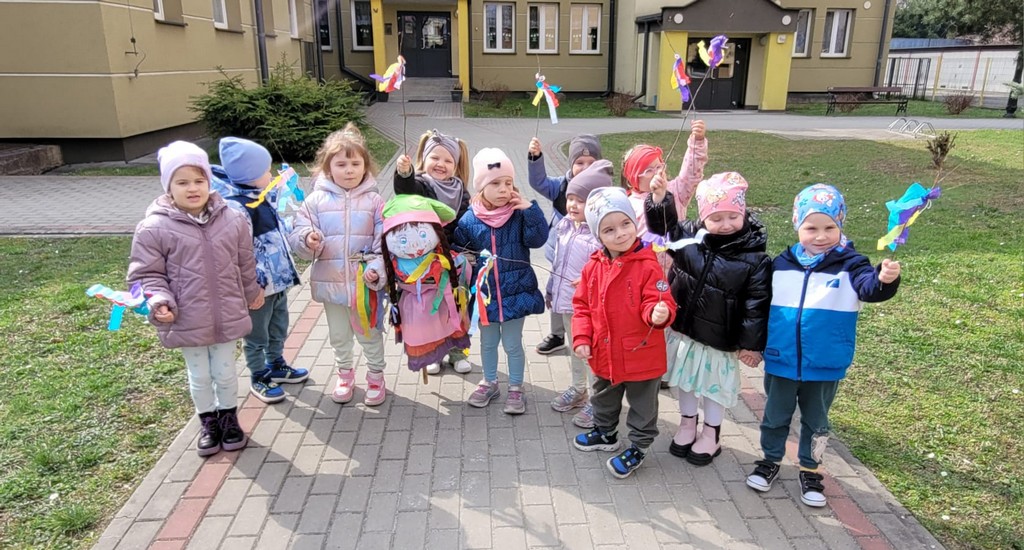 Rozmawiamy także o tradycji Marzanny, która dawniej symbolizowała zimę. Kiedyś ją topiono, aby przegonić zimne dni i powitać te cieplejsze, wiosenne. W naszym przedszkolu wspólnie tworzymy Marzannę i spacerujemy z nią, śpiewając piosenki i symbolicznie żegnając zimę. Tak było też w tym roku! Na nasze dzieci czekał też występ aktorów „Teatru z uśmiechem” z Krakowa pt. „Pszczółki z miodowej polanki”.